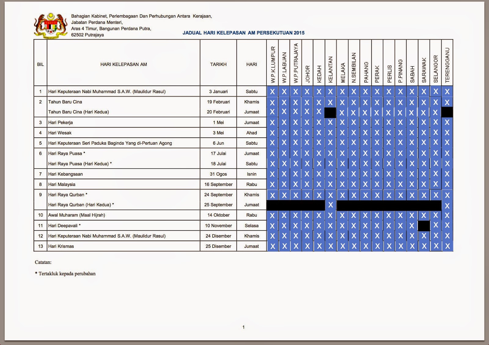 Bednera negeri pahang dikibarkan separuh tiang di perkarangan utc kuantan berikutan kemangkatan paduka ayahanda sultan pahang, sultan ahmad shah pagi tadi di institut jantung negara (ijn). Kelantan, pahang, perak, perlis, pulau pinang, selangor, terengganu and semua wilayah persekutuan (kuala lumpur , putrajaya dan labuan). Anda boleh mula dapatkan kalender 'kuda' bagi tahun 2021. Malaysia public holidays 2018 (tarikh hari cuti umum malaysia 2018). Jadual hari kelepasan am negeri 2016. Tarikh berikut mungkin diubah suai. Banyak tempat menarik terdapat di pahang seperti pantai cherating, pantai teluk cempedak, taman negara endau rompin. Ini dia senarai cuti umum malaysia bagi tahun 2019. Pindaan cuti sekolah dan takwim persekolahan tahun 2020 juga telah diumumkan oleh kementerian pendidikan kumpulan b : Tarikh cuti umum malaysia 2016 untuk semua negeri. Pahang bantah cuti hari jumaat. Savesave cuti umum pahang 2018.docx for later. Negeri pahang adalah negeri terbesar di semenanjung malaysia dengan kuantan adalah ibu negeri.