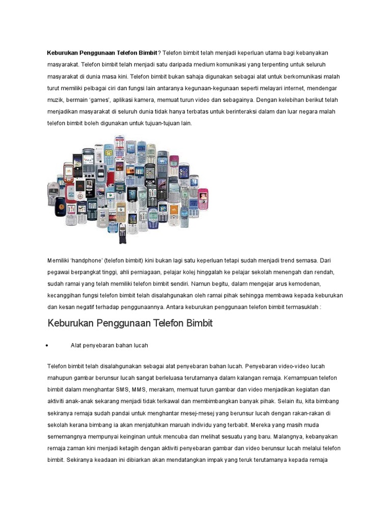 Keburukan Dan Kebaikan Penggunaan Telefon Bimbit from imgv2-1-f.scribdassets.com Telefon bimbit adalah penting kerana membawa pelbagai faedah kepada segenap masyarakat. Dalam hal ini, penggunaan telefon bimbit yang dalam situasi yang fully focused seperti di dewan kul iah dan rumah ibadat. Pada zaman revolusi teknologi telekomunikasi dan multimedia tanpa had ini, telefon bimbit digunakan dengan meluas dalam kalangan masyrakat. Dia mahu menunjukkan bakatnya di hadapan masyarakat. Ada yang di kalangan pelajaran yang lemah dalam pelajaran sekolah dan berjaya dalam kegiatan kokurikular. Hal ini disebabkan karena setiap kalangan masyarakat sudah dapat memiliki benda mungil penuh manfaat ini. Kesimpulannya, penggunaan telefon pintar dalam kalangan remaja memberikan seribu satu faedah kepada sesiapa sahaja yang menggunakannya, tetapi sebagai pengguna kita perlu bijak menggunakan gajet atau alat yang dicipta dalam dunia serba canggih ini dengan cara yang betul. Tambahan pula, kini para pelajar masih dalam proses tumbesaran.