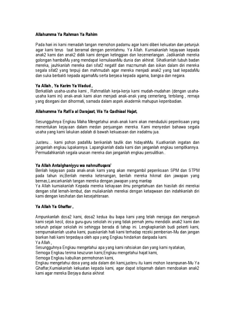 Tahun ni peperiksaan spm ada dua fasa. Pada malam yang penuh kedamaian. Perbanyakkan istighfar dan memohon keampunan kepada allah. Doa solat hajat untuk peperiksaan. Kami menadah tangan mohon dikabulkan. Doa solat hajat dalam menghadapi peperiksaan. Solat hajat boleh dilakukan pada waktu siang dan malam (kecuali selepas subuh dan asar). Hajat dipohon ketika sujud terakhir. Facebook twitter google+ pinterest linkedin whatsapp. Sempena hari anugerah kecemerlangan 07. Solat sunat hajat memohon kejayaan Selepas memberi salam, bacalah doa solat hajat. Maka selesailah solat istikharah tersebut.